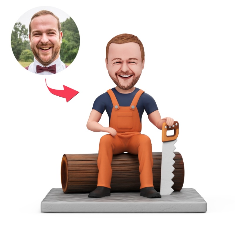 Custom Male Lumberjack Sitting on Tree Section Handheld Saw Custom Bobblehead With Engraved Text Gift
