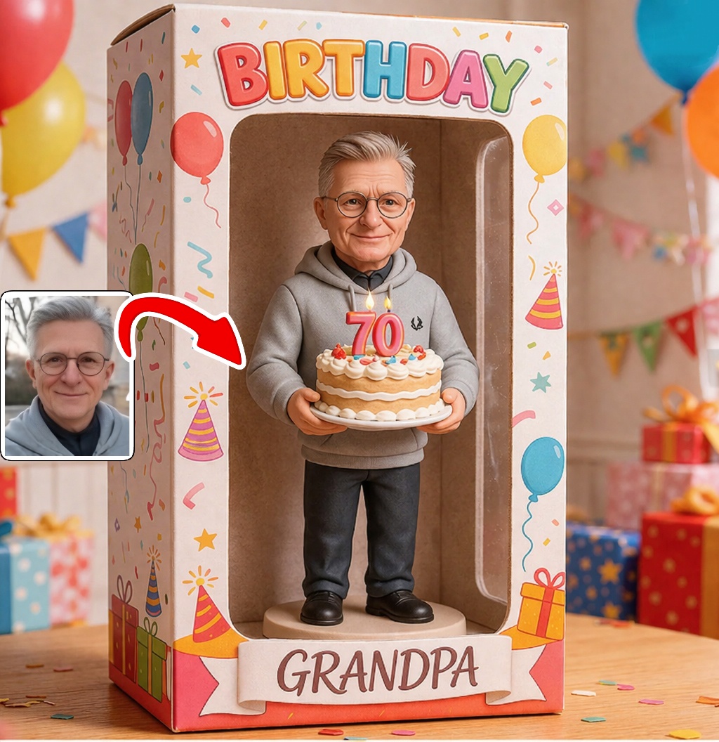 Turn your photo into a custom full-body clay bobblehead, beautifully presented inside a birthday-themed display box – the perfect keepsake gift for your loved ones.