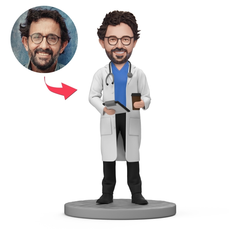 Male Doctor Hold Water Glass and Notebook Custom Bobblehead with Engraved Text