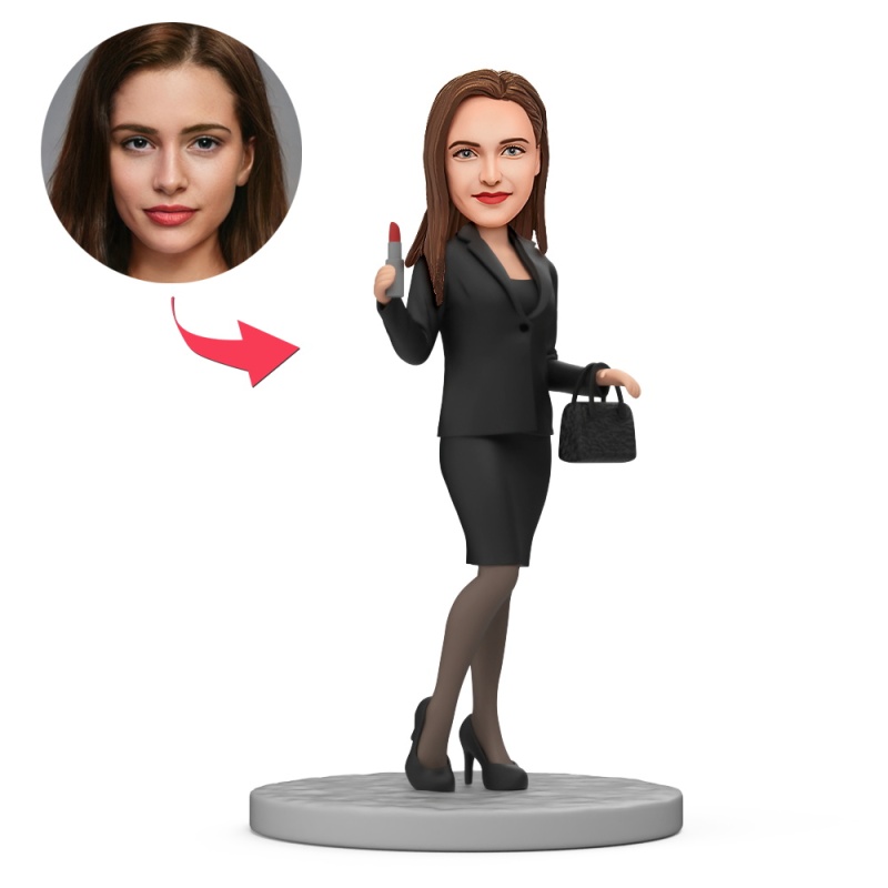Modern Lady in Sexy Black Suit Custom Bobblehead with Engraved Text