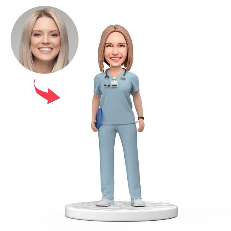 Custom Female Doctor Bobblehead in Light Blue Scrubs with Engraved Text National Doctor's Day Gift