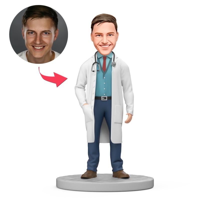 Male Doctor With Stethoscope Wear Blue Shirt Custom Bobblehead with Engraved Text